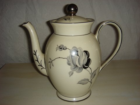 Text available in Danish: Kjøbenhavns Porcelænsmaleri, Sort Rose porcelæn med platinkant. Kaffekande højde 23. Pris: 100 kr. stk. Lager: 5