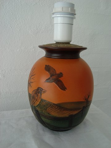 Bordlampe dekoreret med fugle i landskab.
