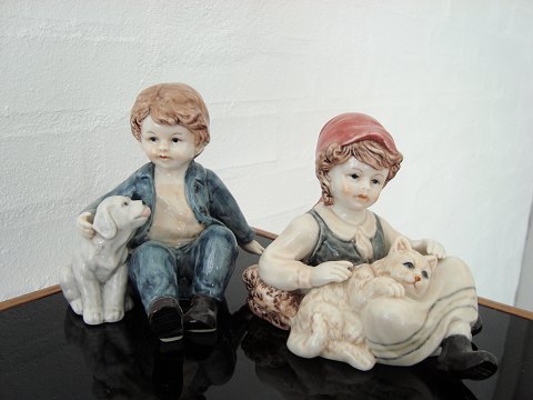 Gamle porcelænsfigurer, dreng med hund og pige med kat (solgt).