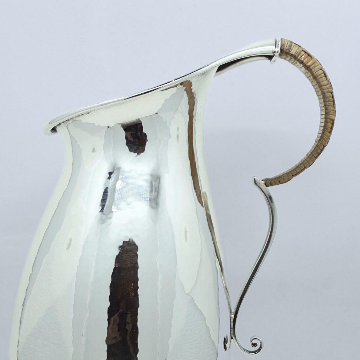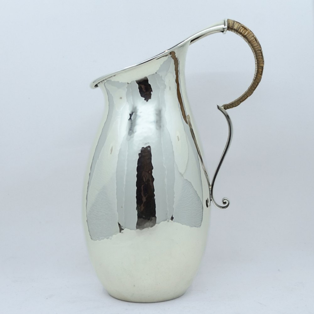 Karl Gustav Hansen for Hans Hansen. Pitcher of lightly hammered sterling silver, half of the handle with cane. From 1933.