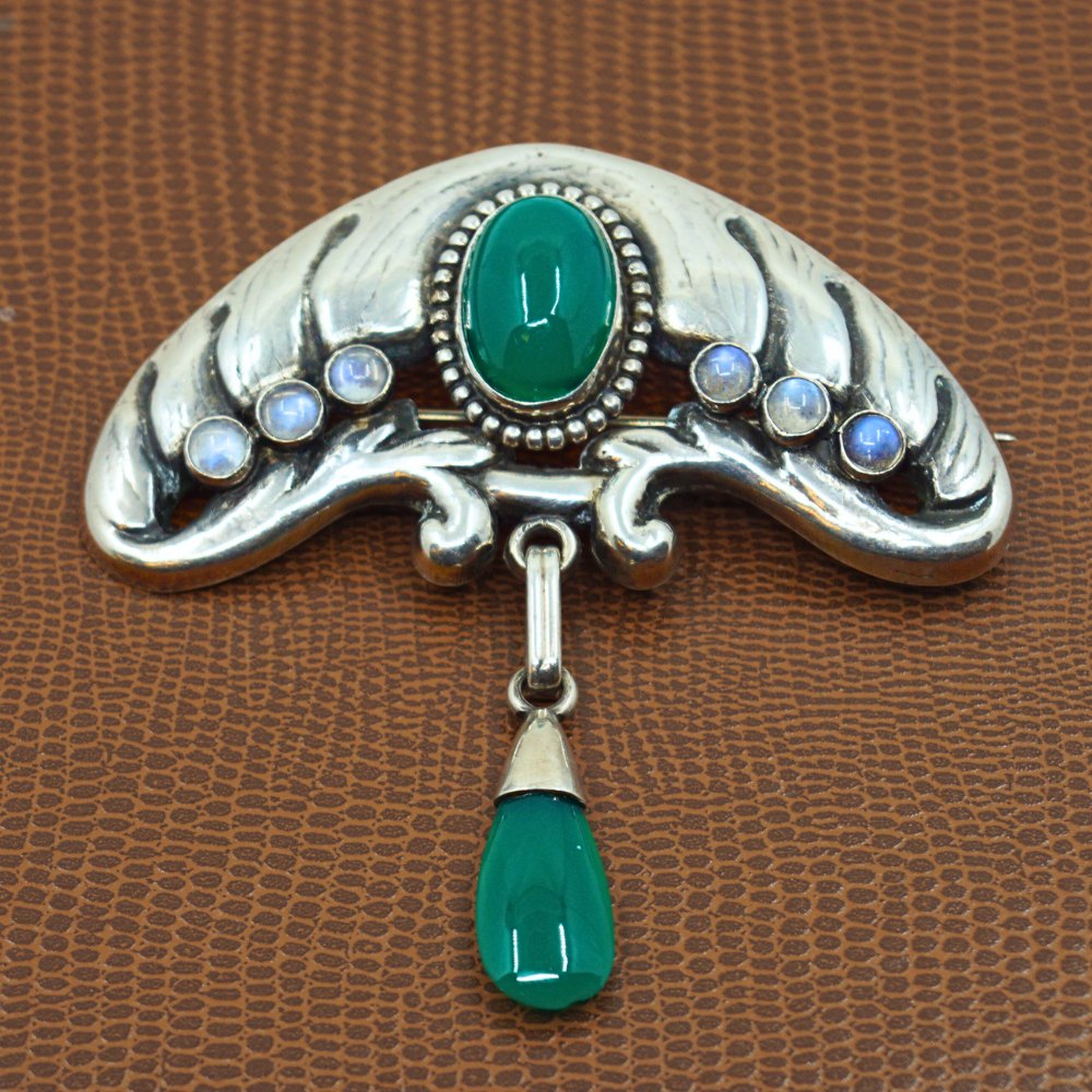 Bernhard Hertz; An Art Nouveau silver brooch with chrysoprase and moonstone