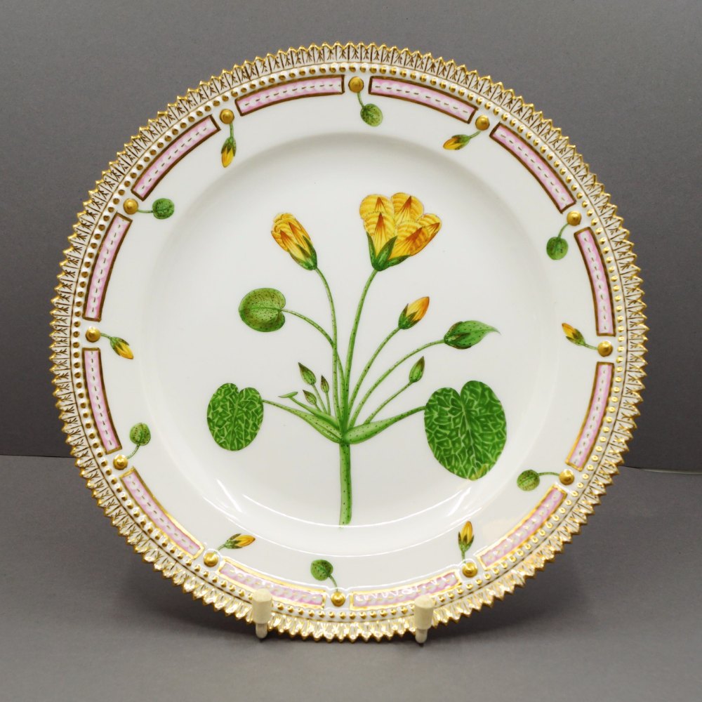 Royal Copenhagen, Flora Danica porcelain; Lunch plate #3550. Decoration: Villarsia Nymphoides L. Decorated in colours and gold with flowers.
