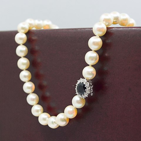 Hartmann's; Pearl necklace strung with knots between the pearls, set with a 18k white gold clasp. Clasp set with a sapphire, 1,86 ct., and several diamonds, total 0,36 ct. Top Wesselton VVS - VS. Clasp 1,2 - 1,4 cm. Length of the chain 45,7 cm. Pearl diam. app. 9 mm.