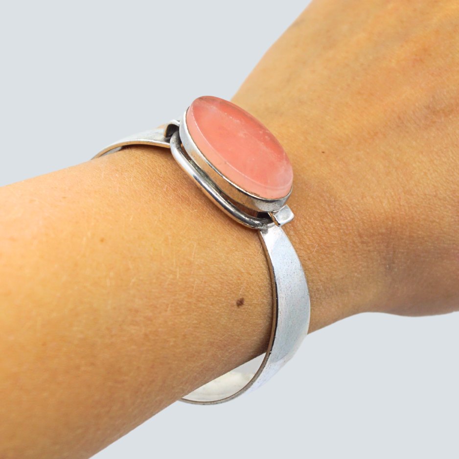 N. E. From; A bangle of sterling silver set with rosa quartz. There are some signs of use on the stone. This has been taken into account in the price.