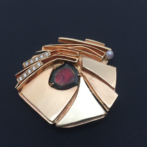 Anette Kræn broche af 14 karat guld prydet med diamanter, perle samt turmalin. H. 4, 5 cm. B. ca. 5 cm. Stemplet: "Anette Kræn J 585 Denmark".