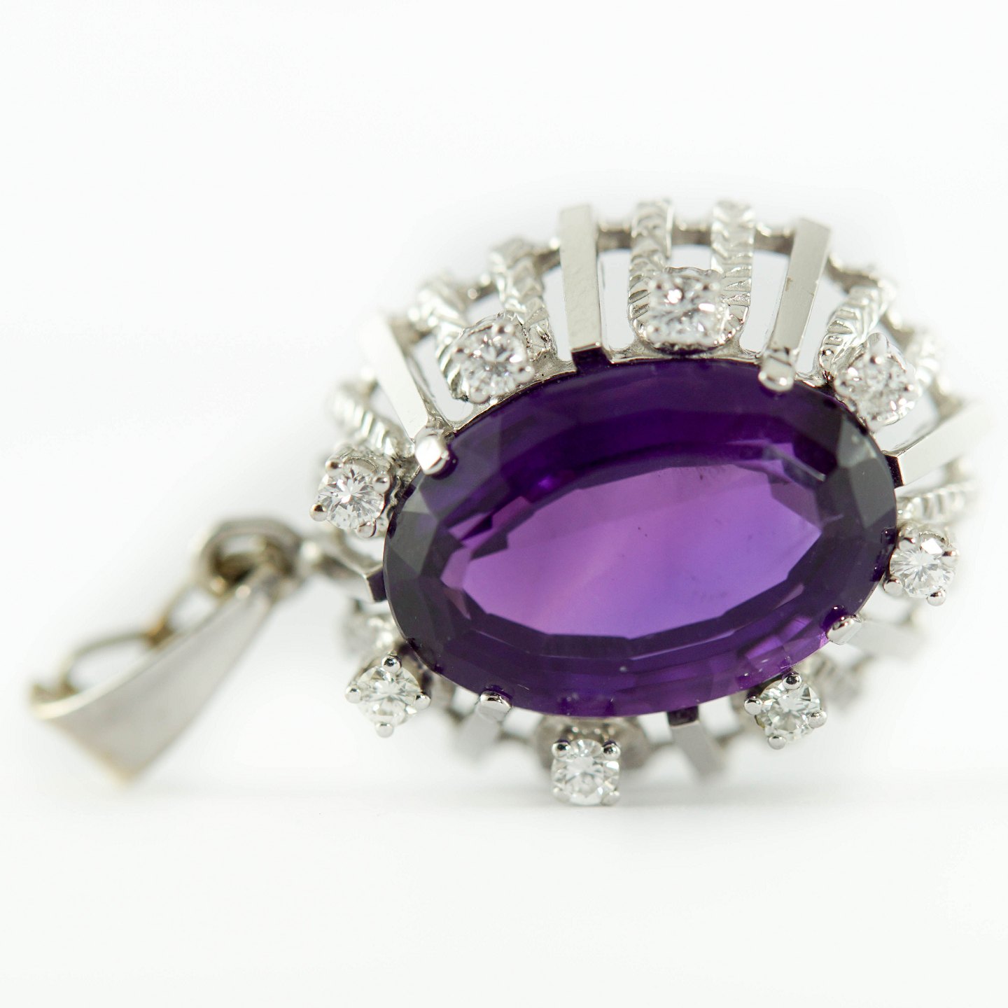 Ametyst- og diamant smykke. Vedhæng af 14 karat hvidguld med oval ametyst omkranset af brillantslebne diamanter. L. 2,5 cm. B. 2 cm.