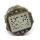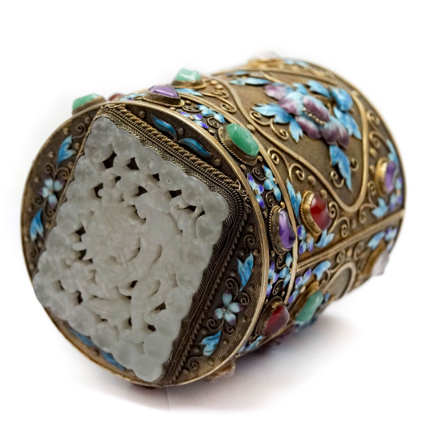 Chinese jar of gilted sterlig silver, set with jade, enamel and semi-precious stones. H. 10,3 cm. Diam. 8,5 cm.
