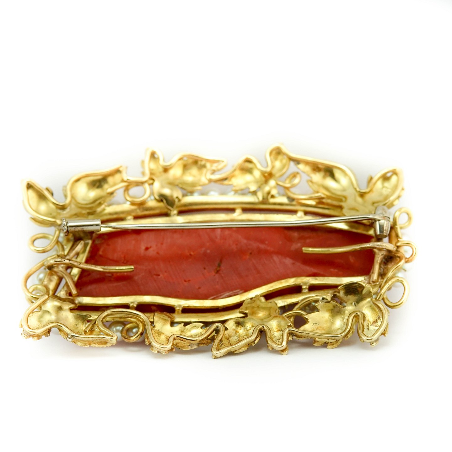 A brooch made of 18k gold, set with a huge coral and pearls. Jewellery around 1900. L. 6,5 cm. W. 3,5 cm.