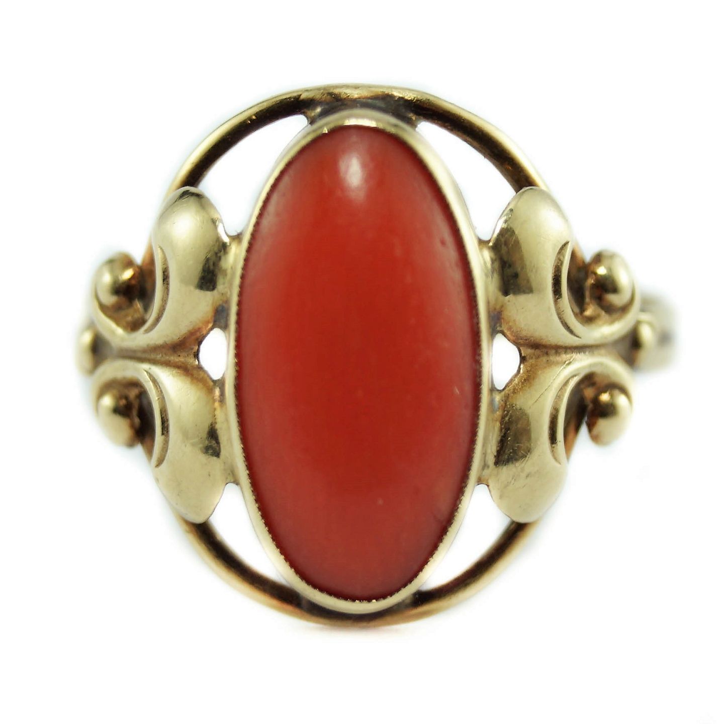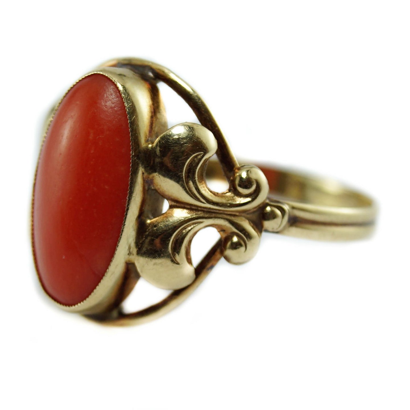 Ring af 14 karat guld, prydet med oval koral. Danmark, 1920.