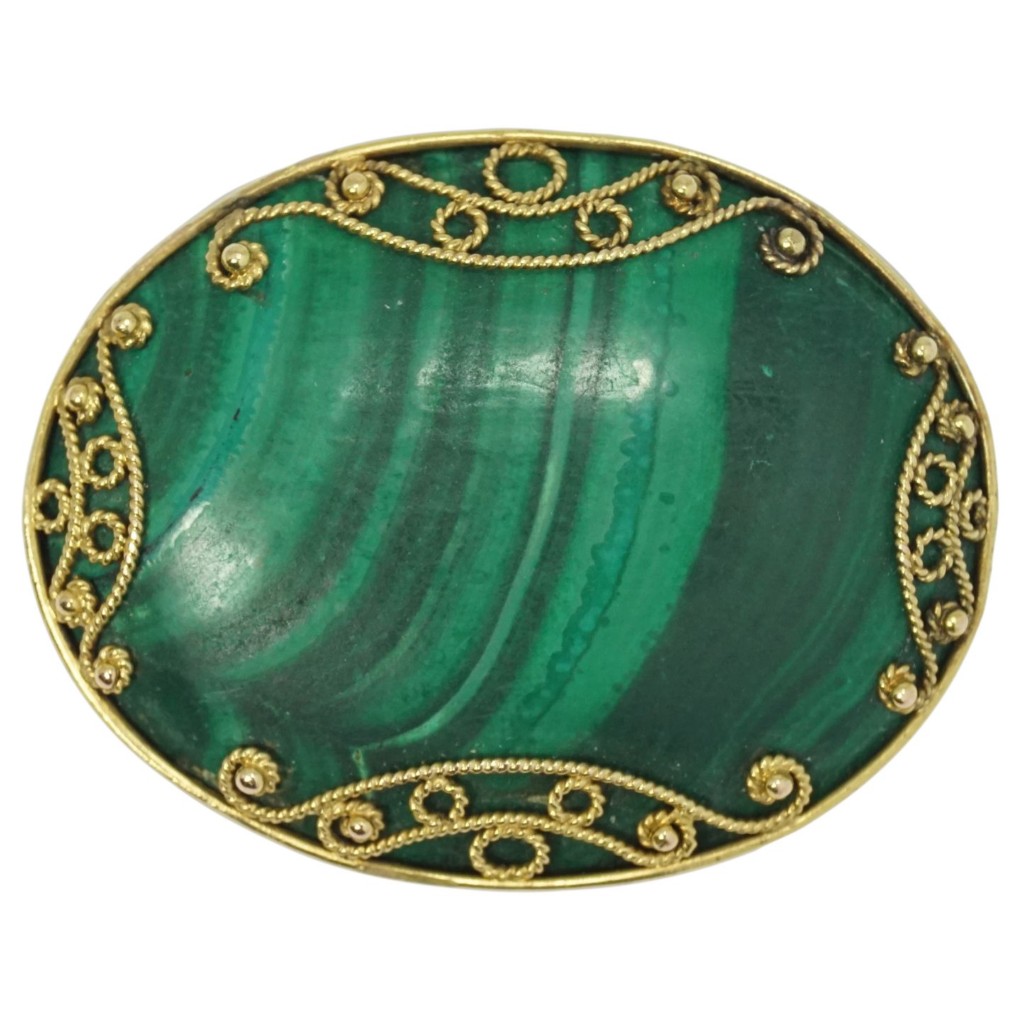 Broche af 14 kt. guld prydet med malakit. L. 4,2 cm. B. 3,2 cm.