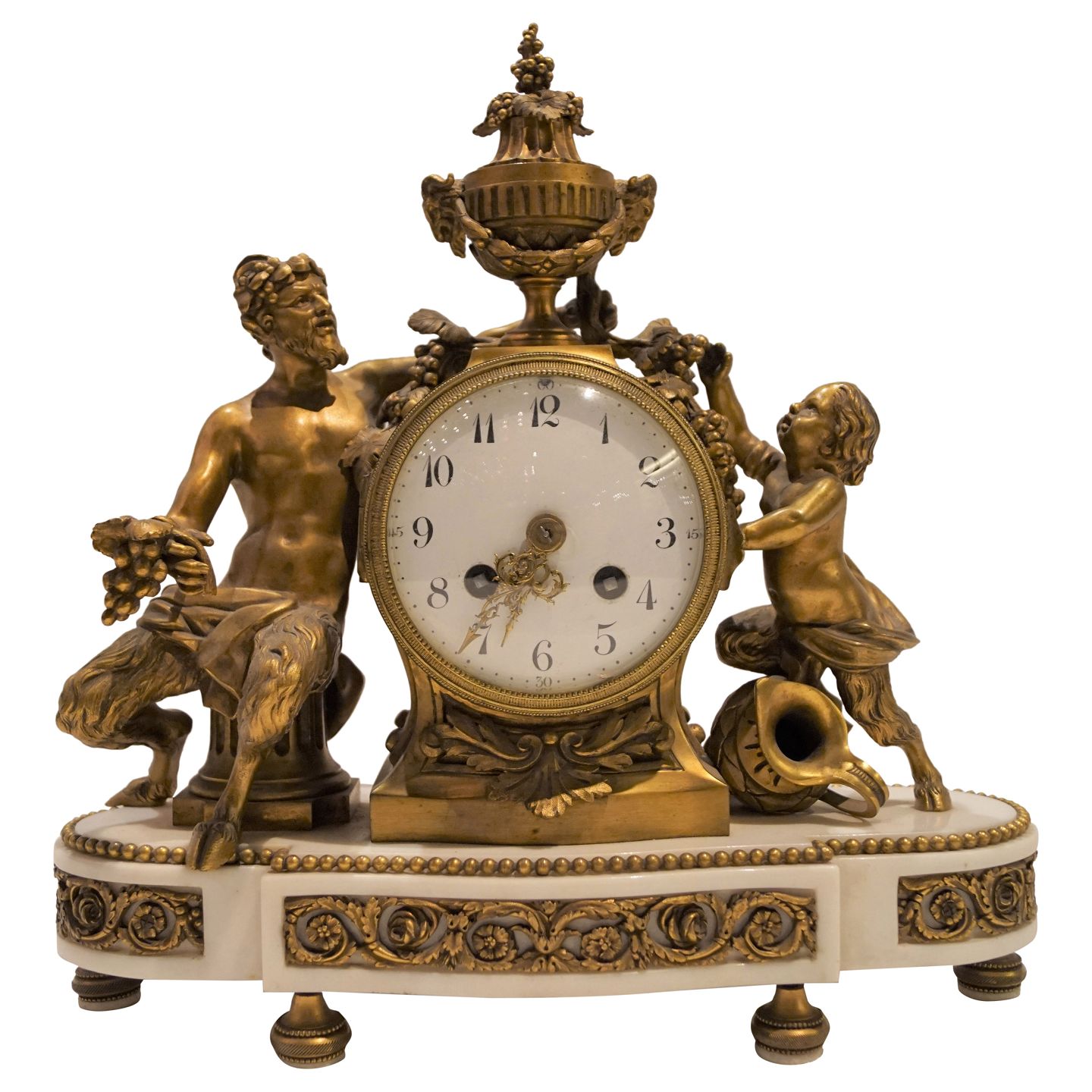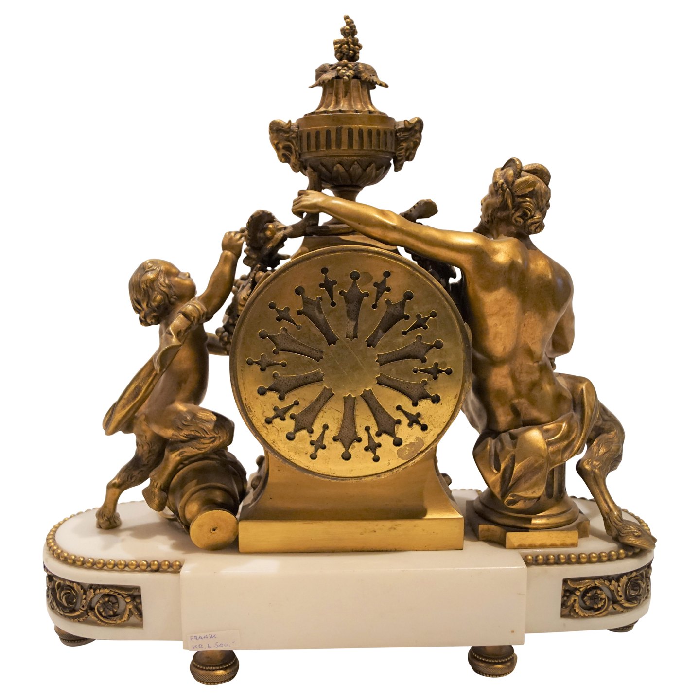 A French clock of gilt bronze, Louis XVI style, base of white marble. France around 1900. H. 32 cm. W. 31,5 cm.