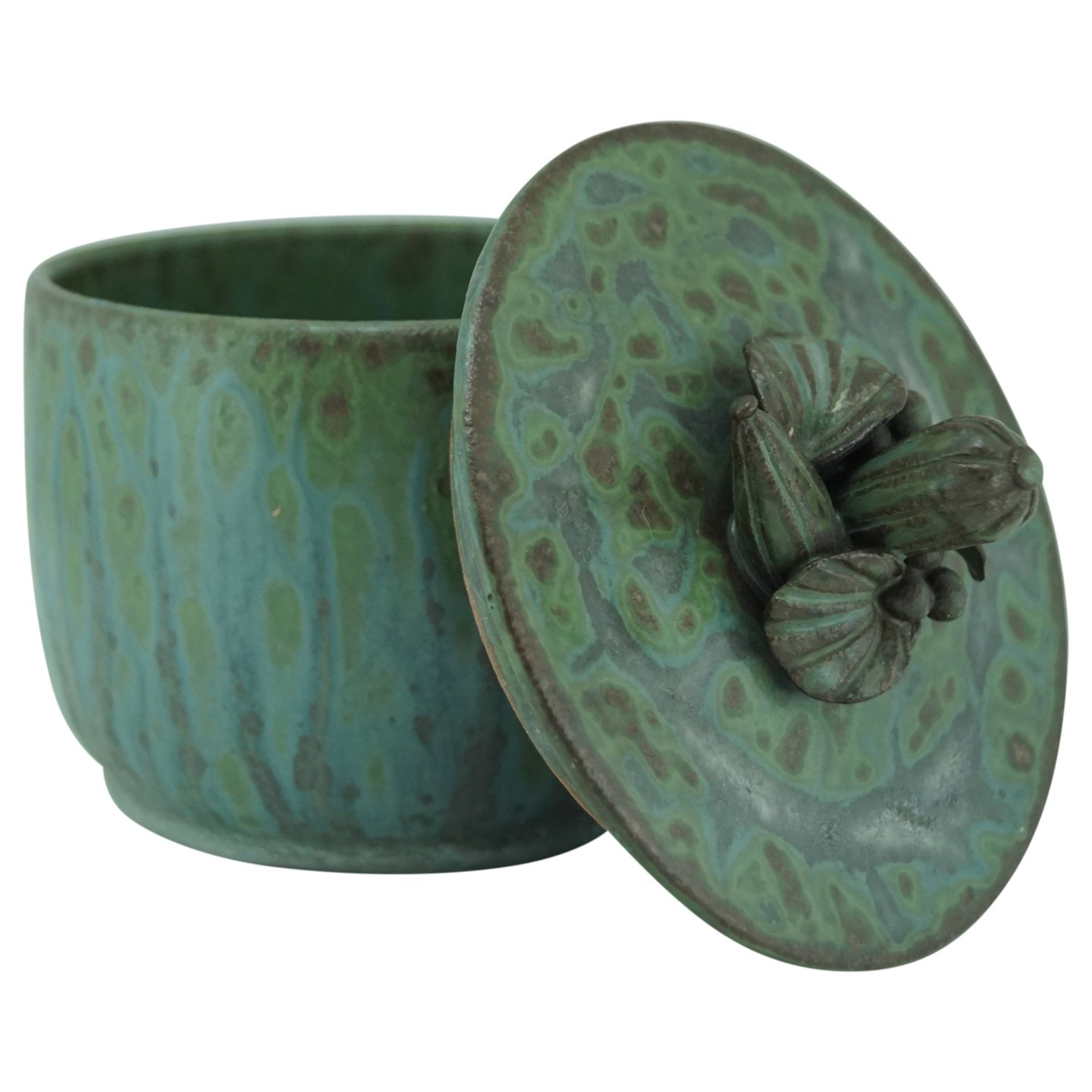 Decorated with a green, blue and grey glaze. H. with lid 11 cm.