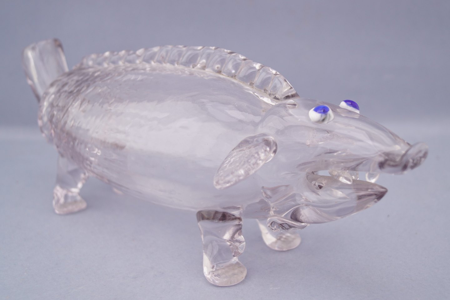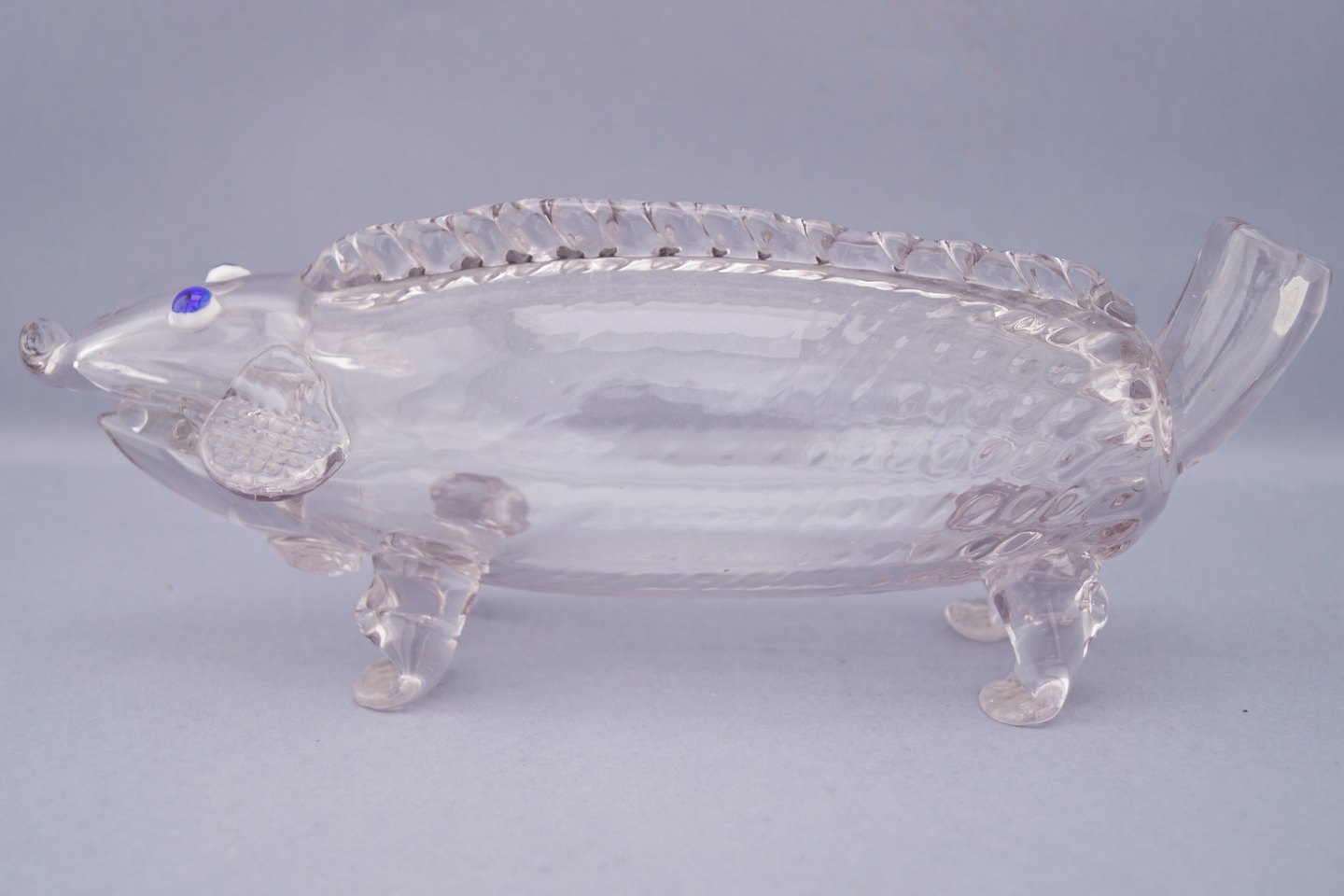 Holmegaard; snapsegris i glas. H. 10 cm. L. 25,5 cm. Antik Damgaard-Lauritsen køber guld, sølv og smykker - både til videresalg og til omsmeltning. Vi synes, det er synd at smelte den danske kulturarv.