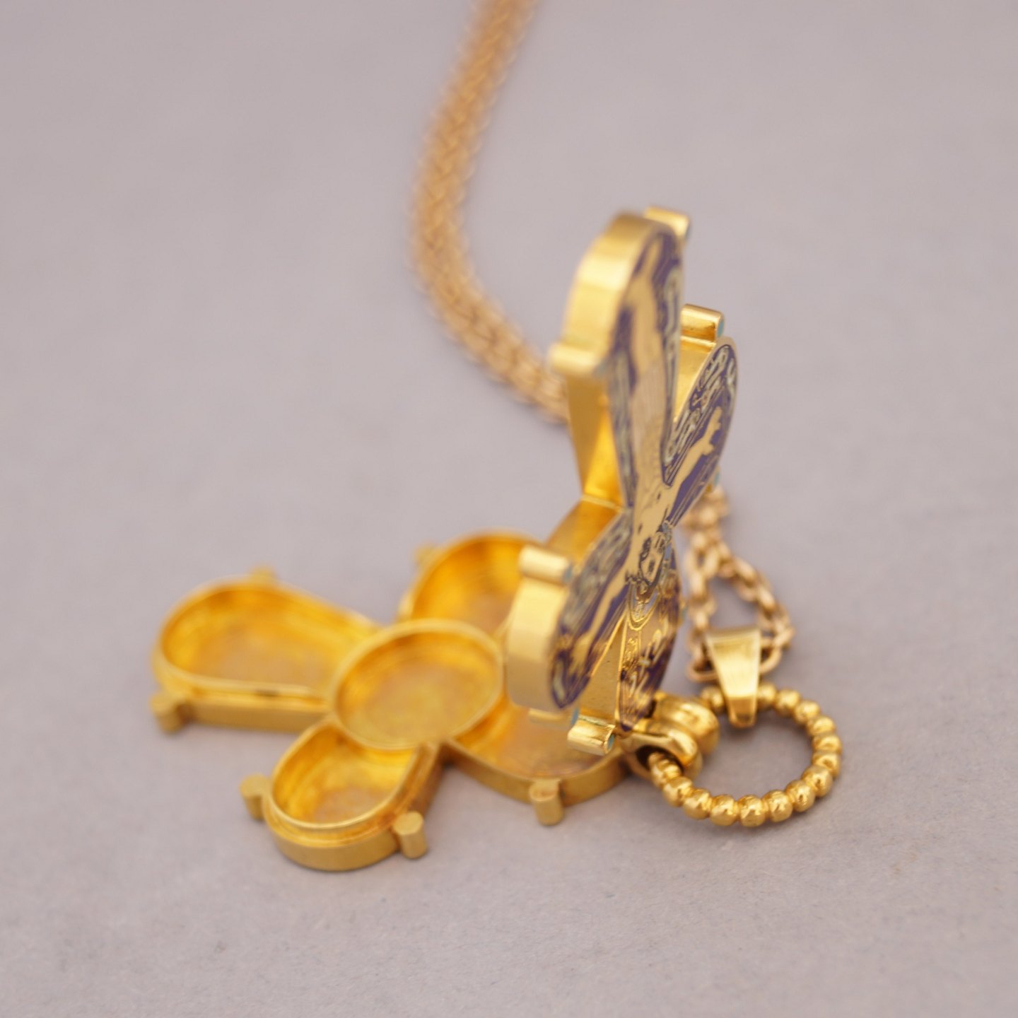 Crucifix of 14 carat gold adorned with enamel and as a medallion you can open. From year 1900-1920. H. 3.5 cm. B. 3 cm. D. 0,5 cm. Chain: 61 cm.