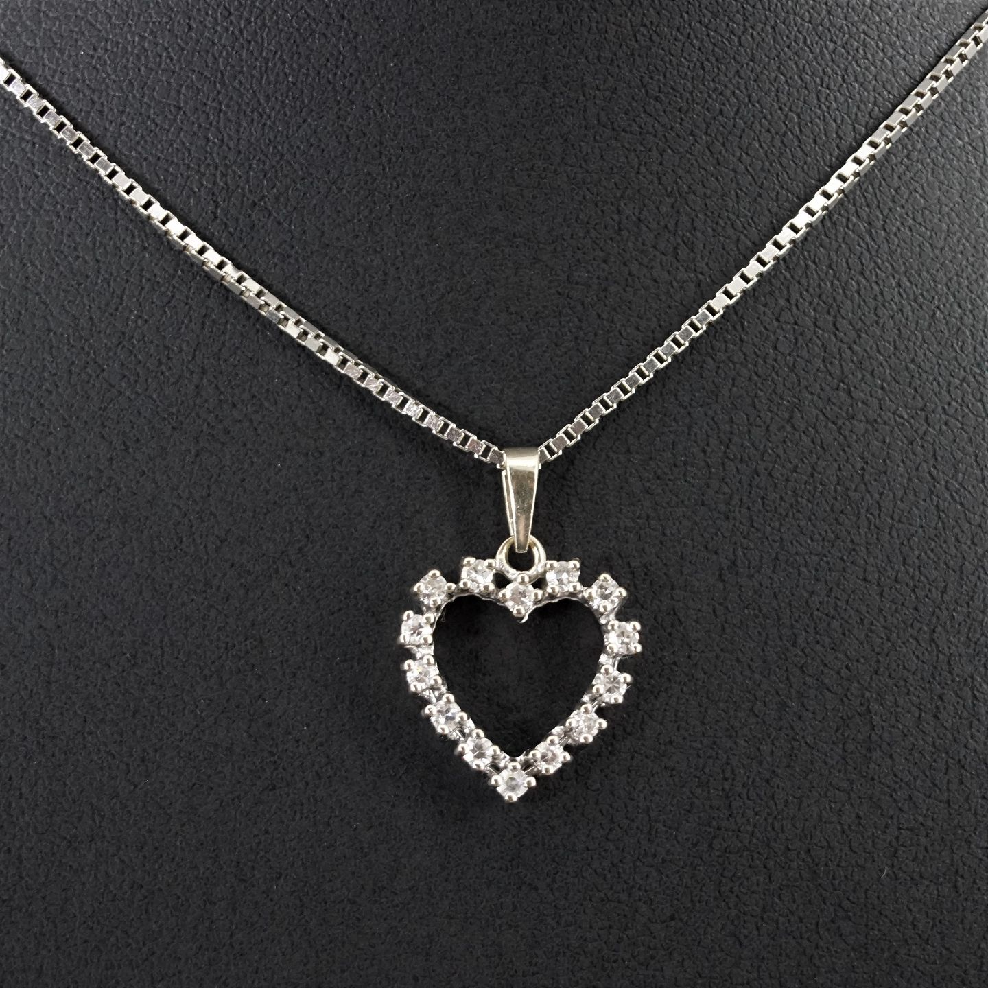 A 14k white gold necklace set with a heart shaped diamond pendant