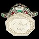 Peter Christian Johansen; Sønderjysk hovedvandsæg af delvist forgyldt sølv, indvendigt forgyldt, prydet med 89 røde, blå og grønne flusser, top med gennembrudt krone, sekskantet fodstykke med balsamgemme. Punslet 1857.