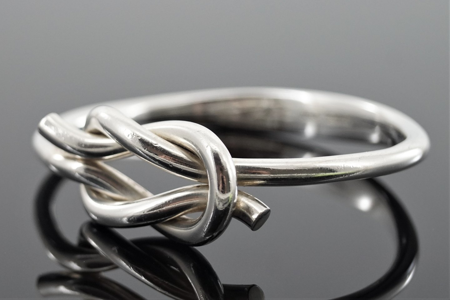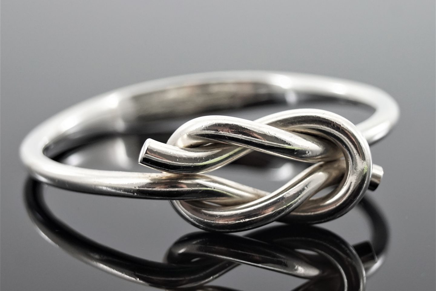 Hans Hansen; Lukket armring af massiv sterling sølv med knude. Indvendige mål: 6,2 cm x 5,5 cm. Stemplet: "Hans Hansen 925 S Denmark".