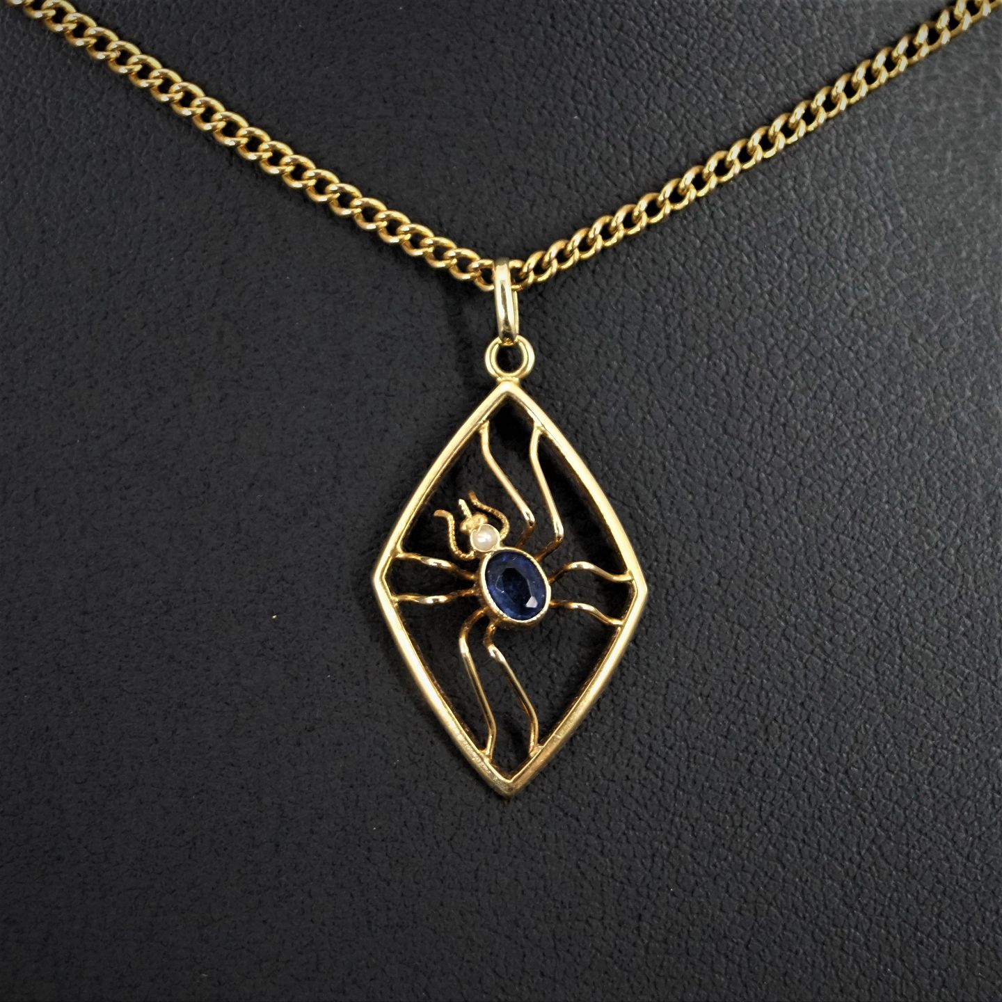 A necklace of 14k gold with a spider shaped pendant, set with a sapphire and a pearl. Necklace l. 47,5 cm.