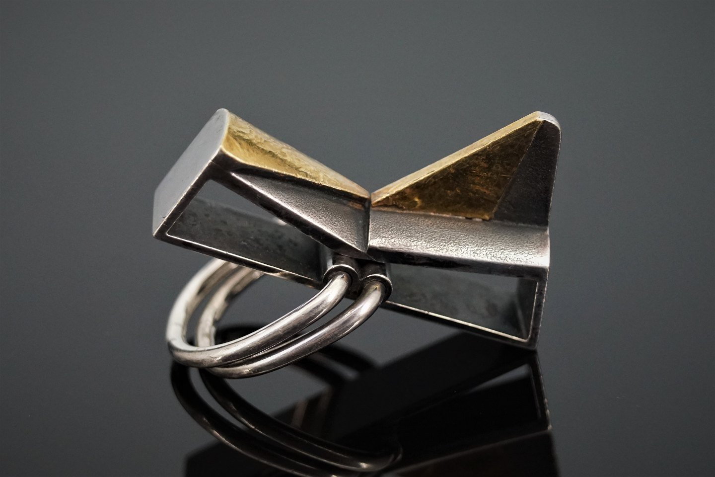 Jan Lohmann; Ring made of sterling silver, oxidized ang gilt silver. Ring rail in two parts. Ring size 50.