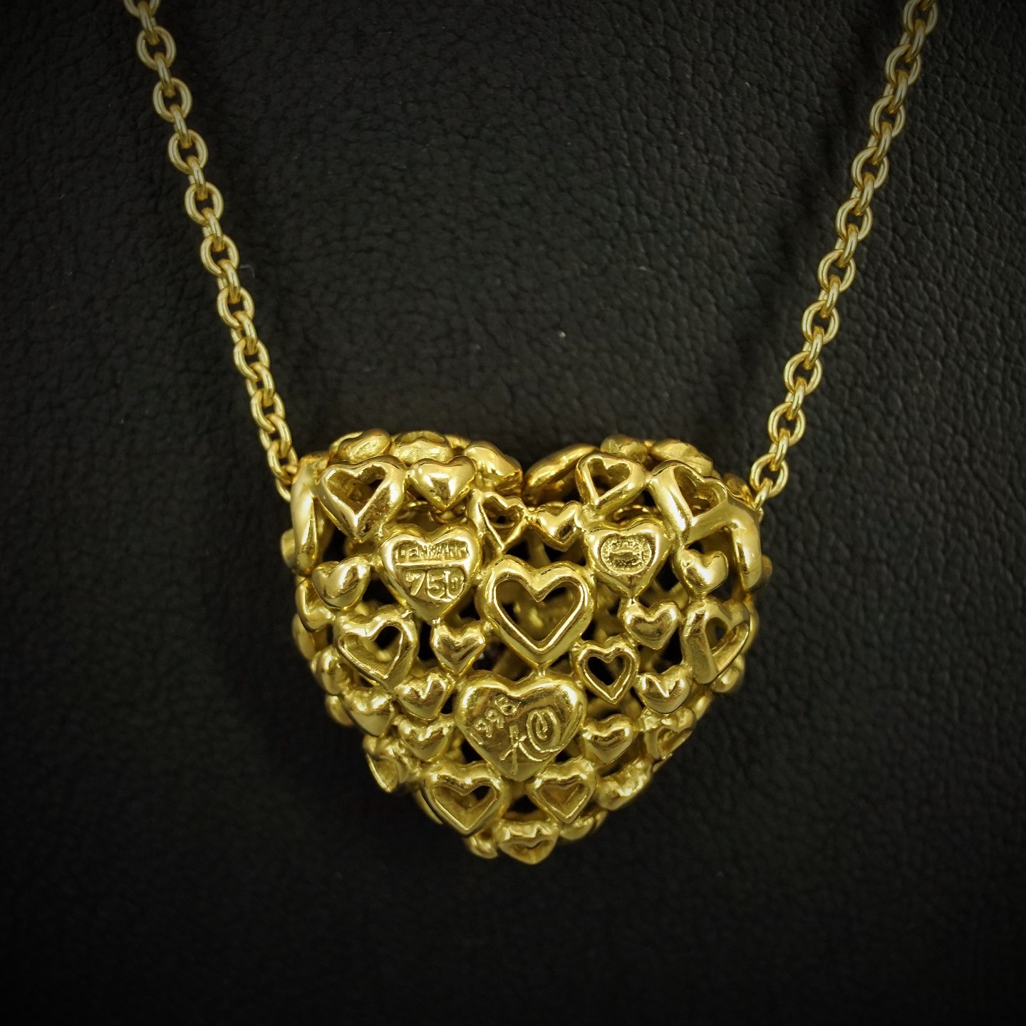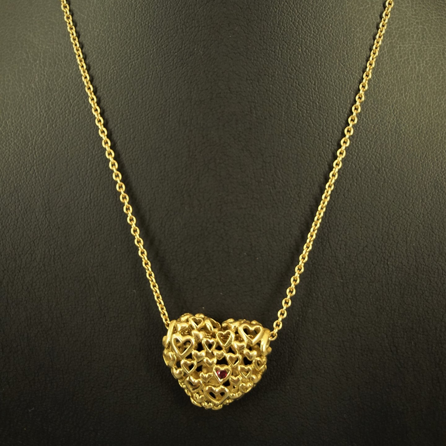 Georg Jensen; A long necklace of 18k gold, a big heart pendant set with a ruby. Necklace l. 75 cm. Pendant h. 2,2 cm. w. 2,4 cm.