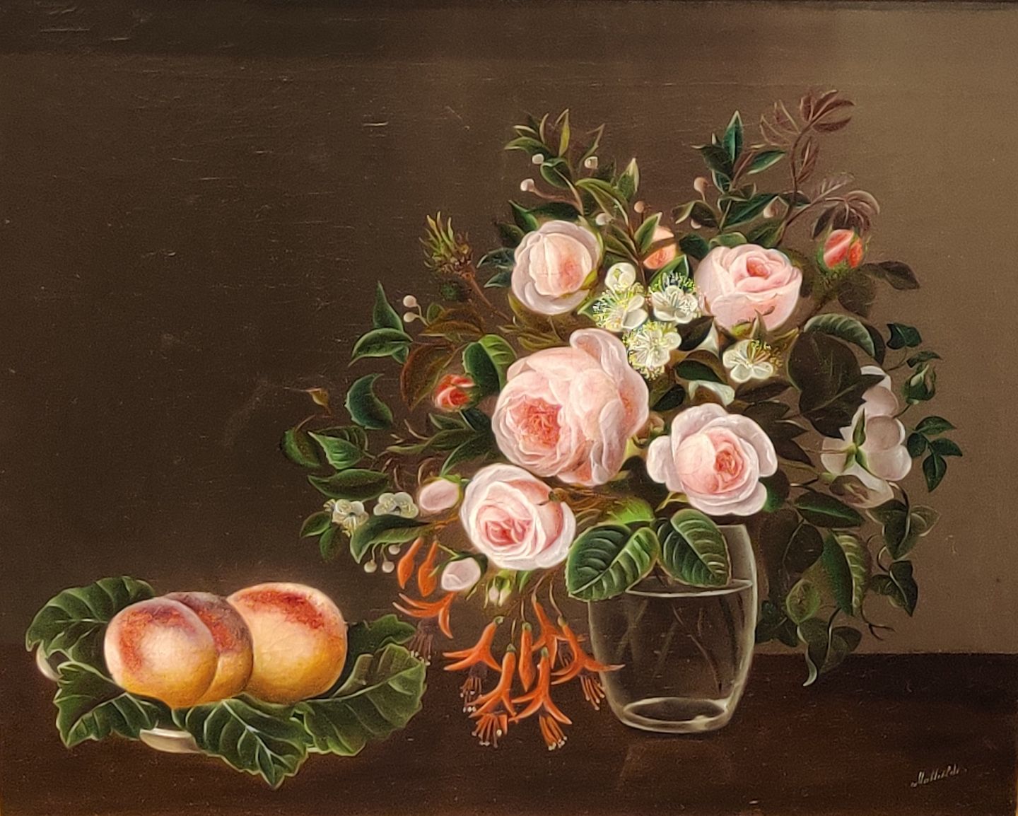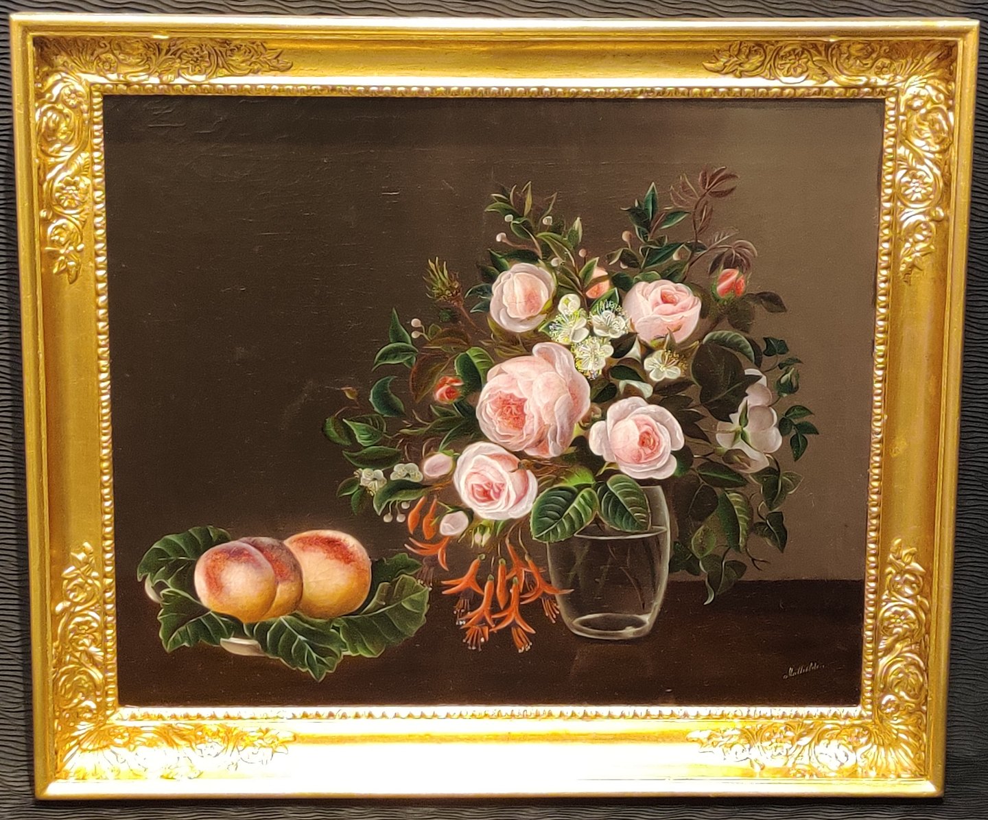 I. L. Jensen school; An oil painting, flower bouquet and peaches