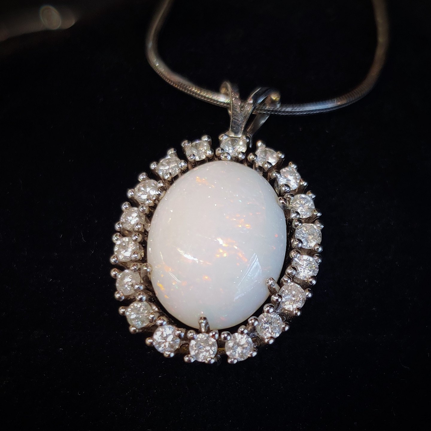 A necklace set with an opal and 18 brillants, mounted in 14k white gold. Pendantwith an oval opal, app. 5,00 ct. and 18 small brillants,