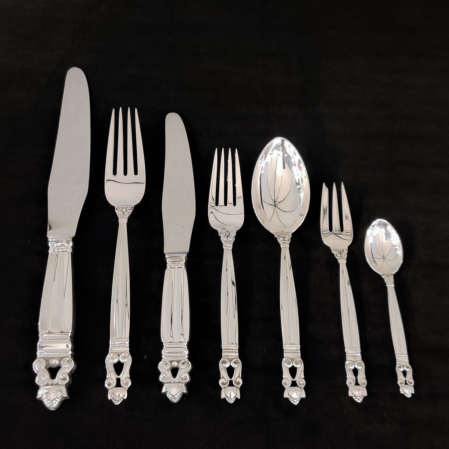 Georg Jensen, Johan Rohde; Konge sølvbestik komplet til seks pers. 52 dele