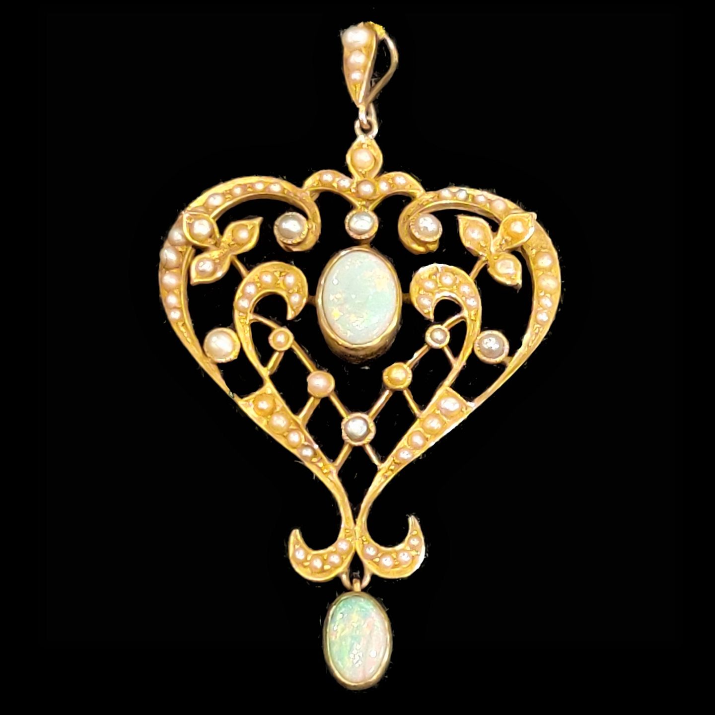 Vedhæng i 14 kt. guld prydet med to opaler samt talrige små perler, omkring år 1920. Opalsmykke h. 5,5 cm. B. 3,3 cm.