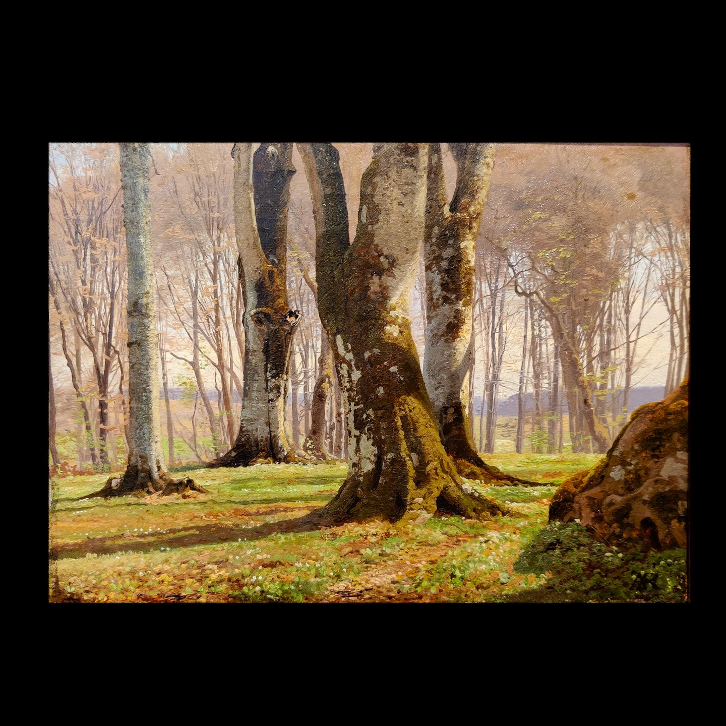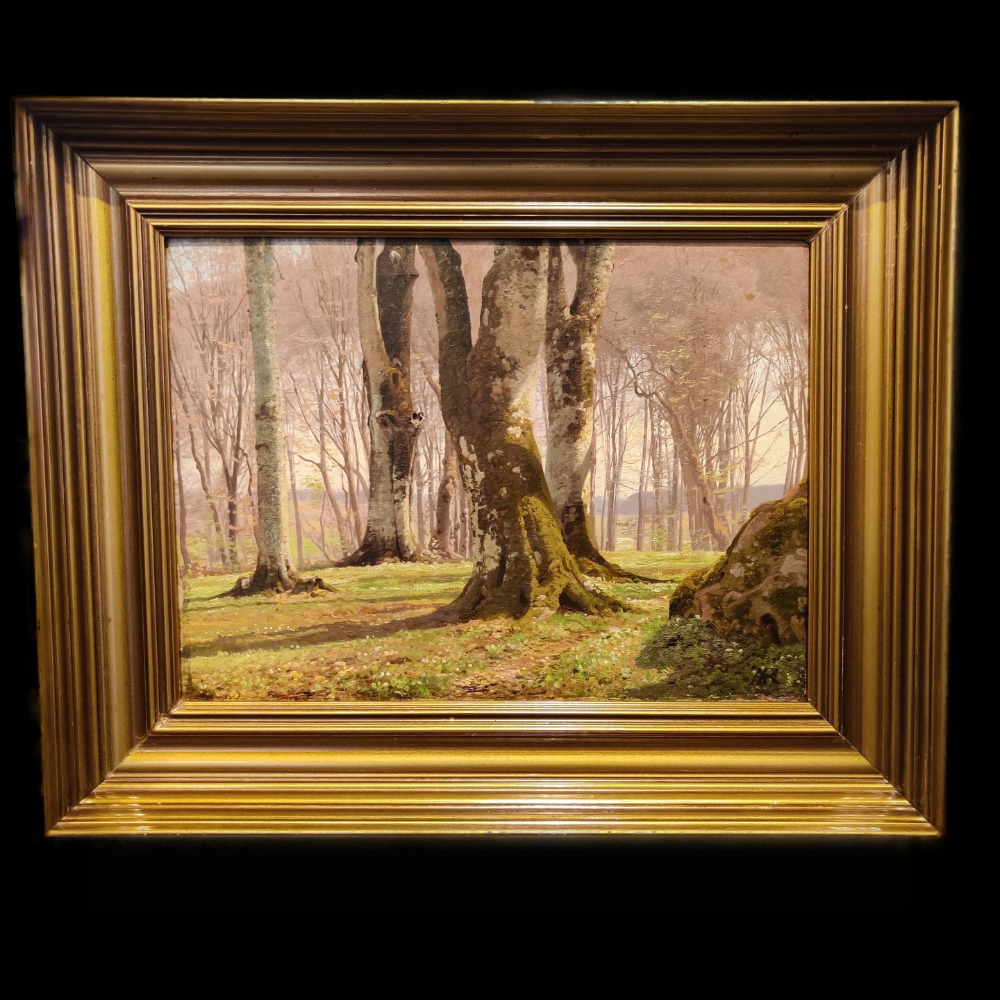 A. E. Kieldrup; Painting, forest scenery. Oil on canvas. Signed with monogram; "AEK". 31,5 cm x 23 cm. With frame: 43 cm x 34,5 cm. Danish art. A. E. Kieldrup, b. Haderslev, Denmark, 1827, d. Copenhagen, Denmark, 1869.