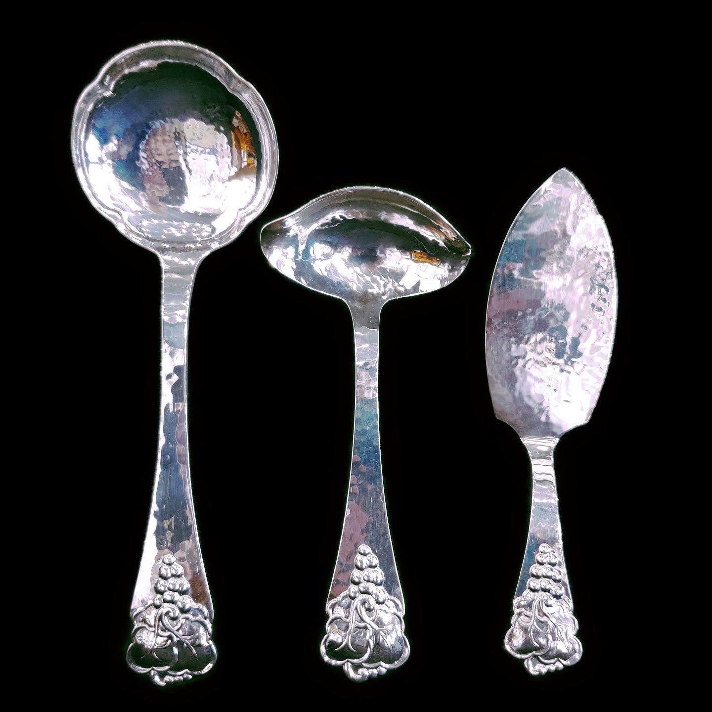 Christian Knudsen Hansen; Servring cutlery in hammered silver. Sold separately DKK 800,-