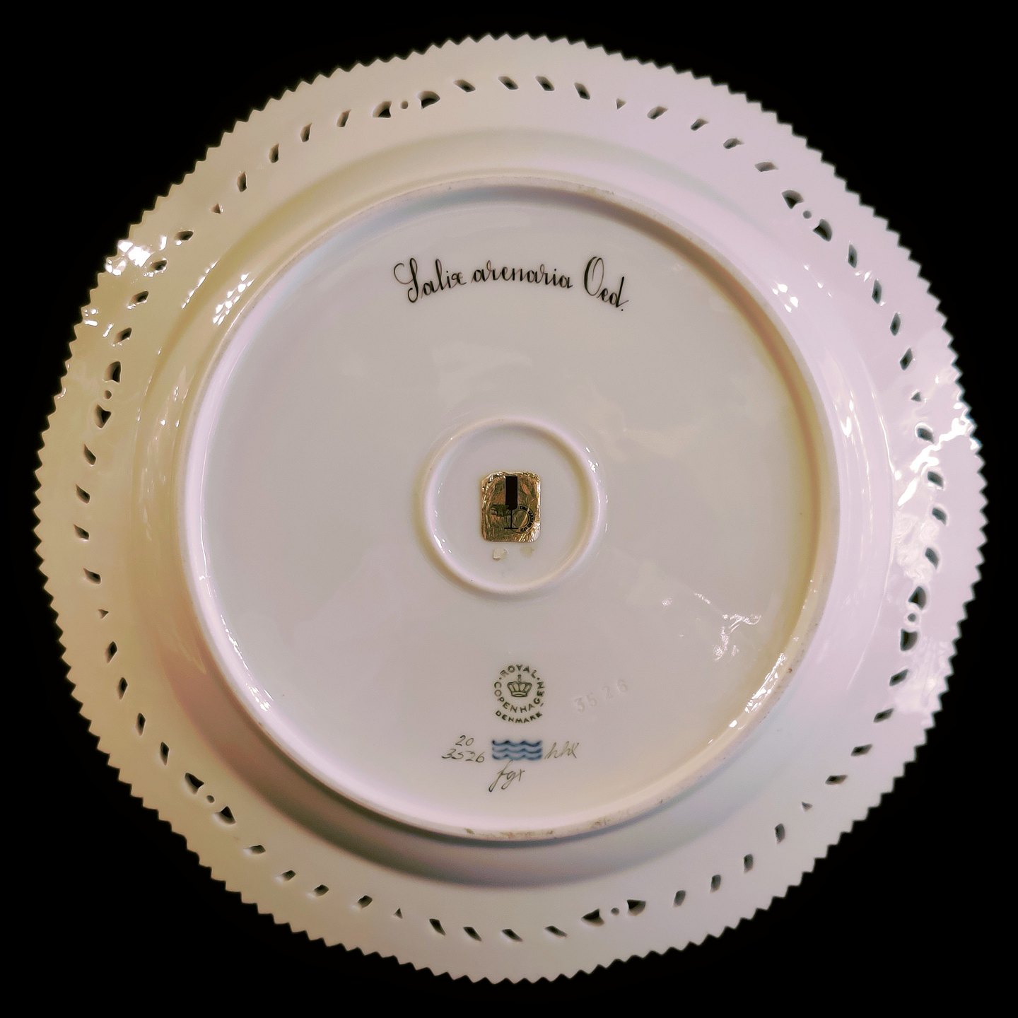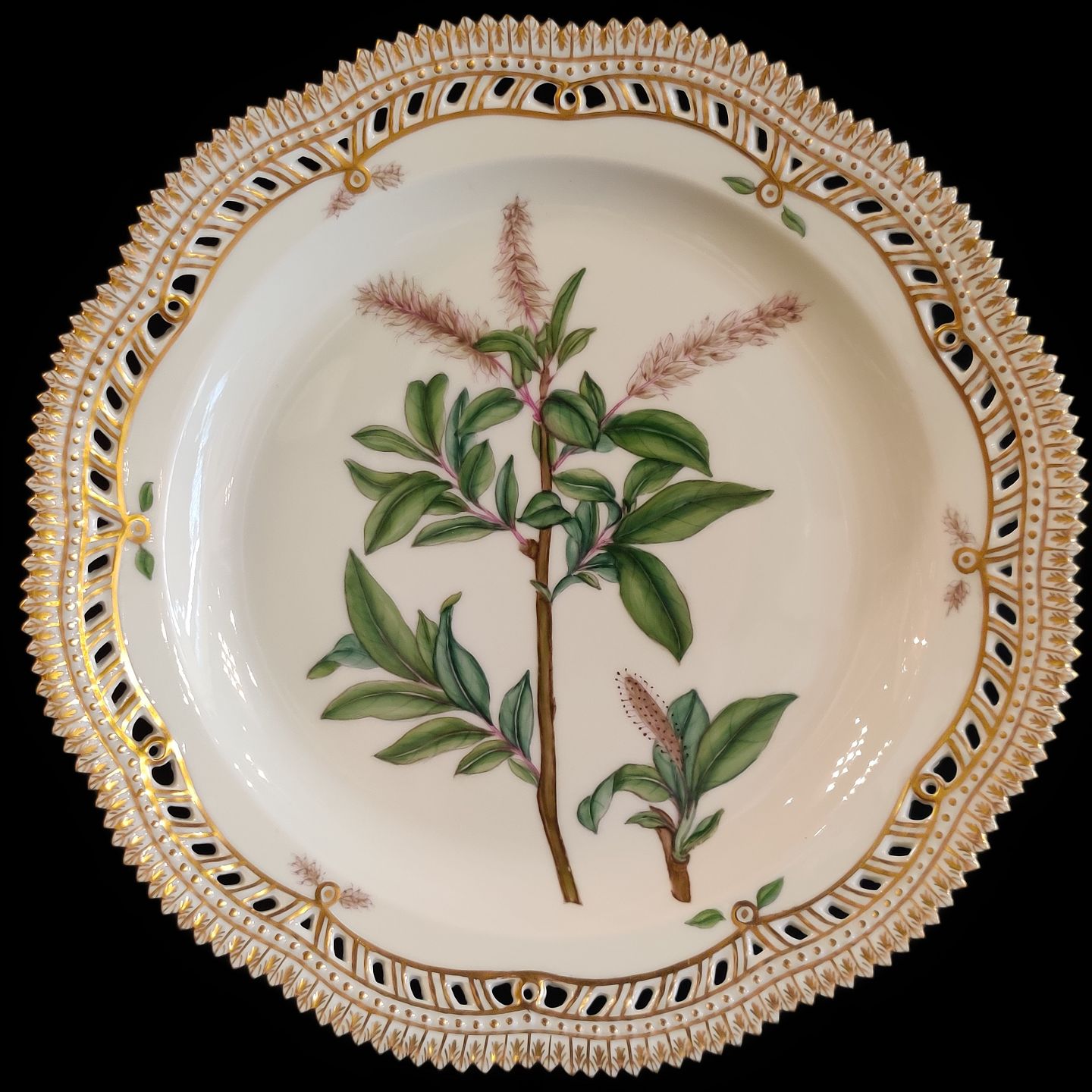Royal Copenhagen, Flora Danica porcelain; Plate #3526 with pierced border. Decoration: Salix arenaria Oed. Decorated in colours and gold with flowers. Diam 27 cm.