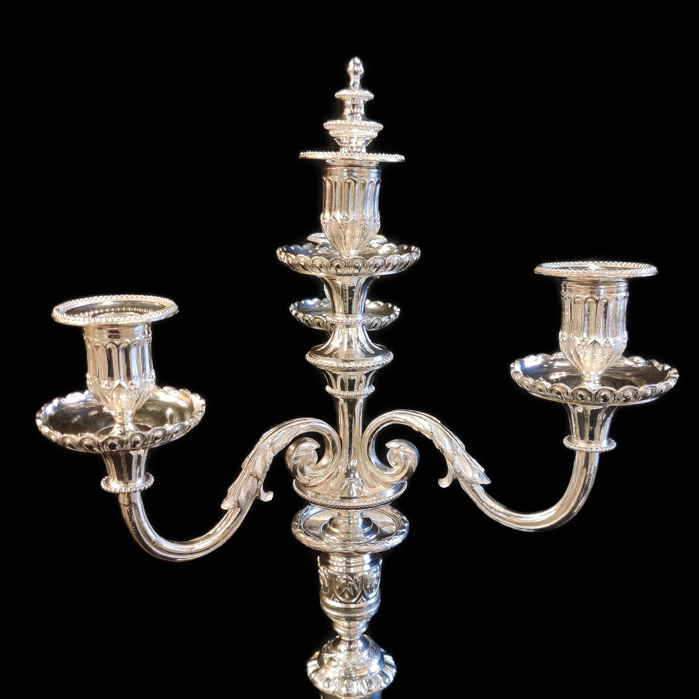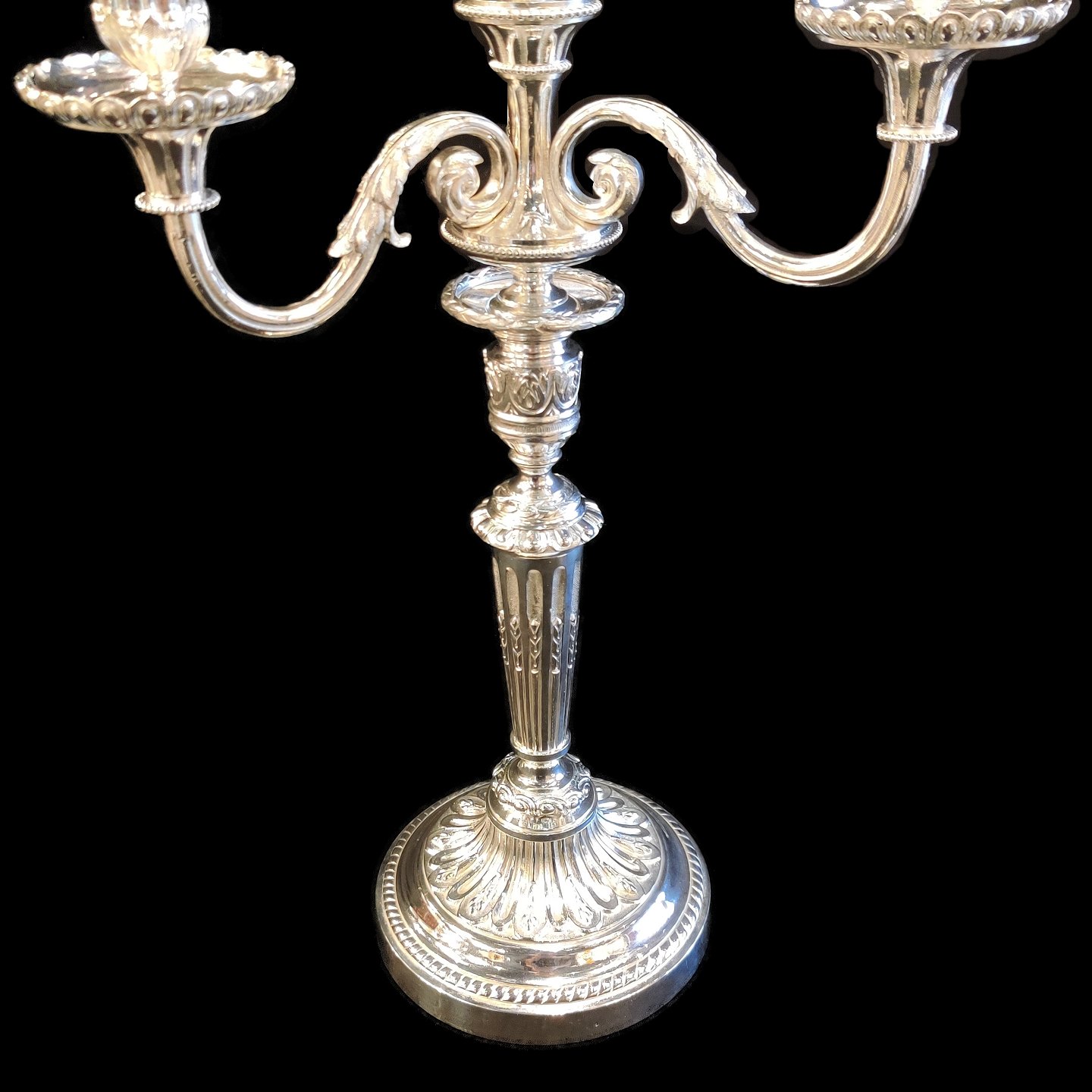 A pair of French candlesticks of silver plated bronze. Three armed candlesticks on round bases. With room for 4 candles.