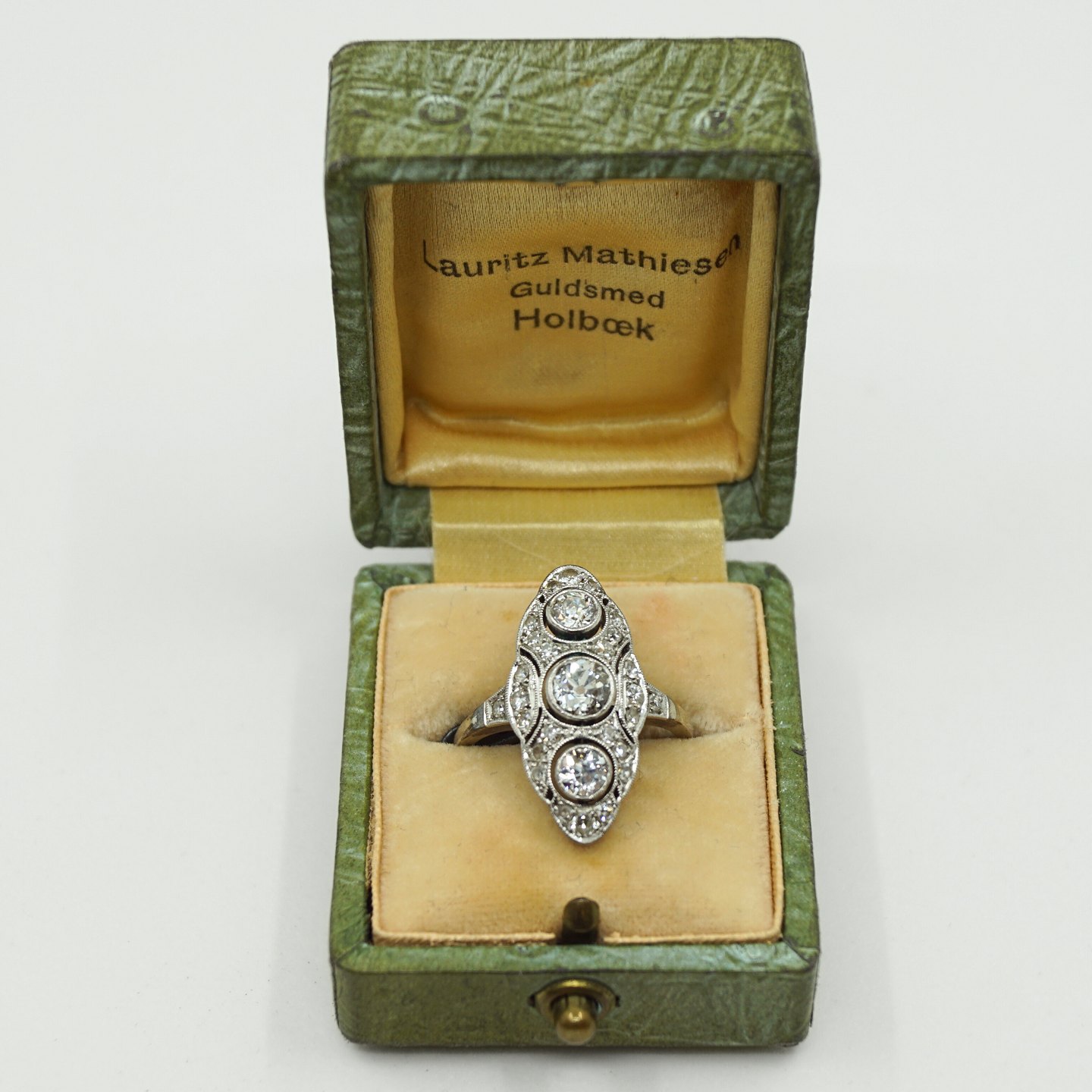 Ring of 14k white gold in art deco style. From the 1930s. Set with 3 larger diamonds, with a total of 1.47 ct. Surrounded by numerous