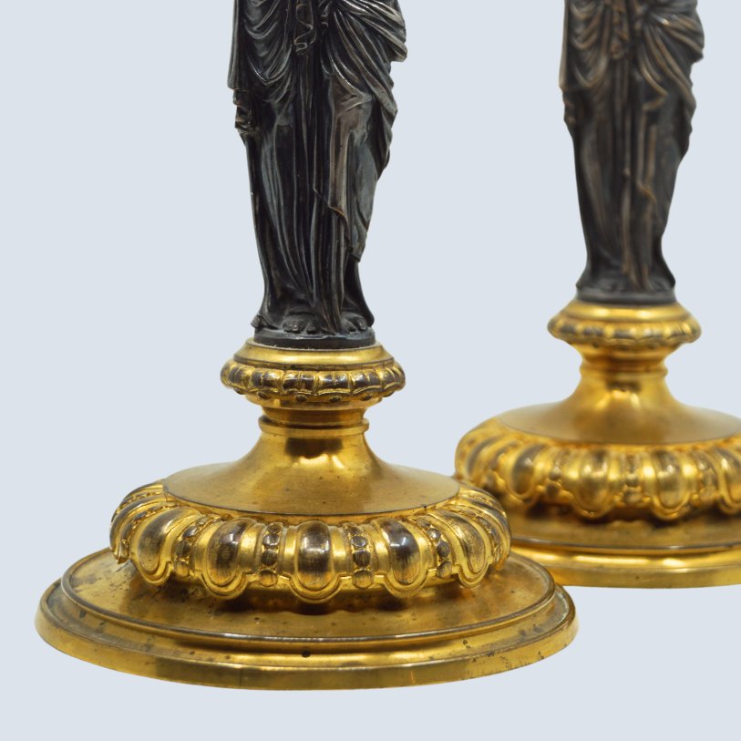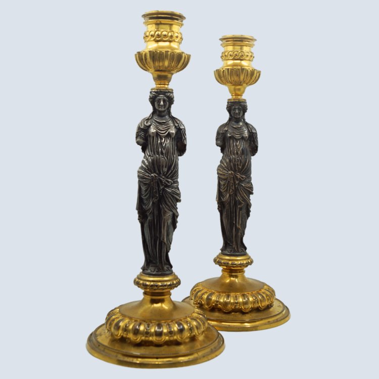 Par Franske bronzelysestager med forgyldt base og top, stammen er en forsølvet karyatide i løse gevanter.