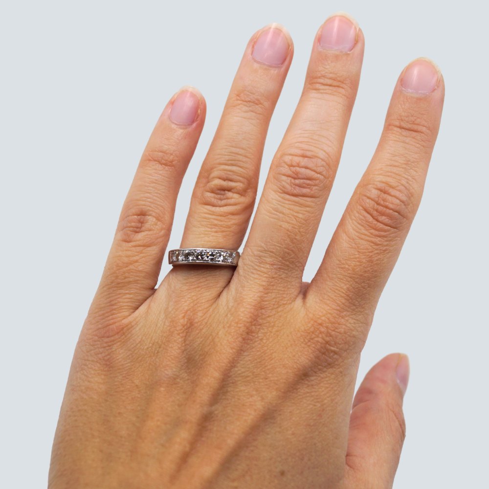 14 kt. hvidguldsring med 7 brillanter, i alt ca. 0,70 ct. Farve: Wesselton Klarhed: VVS. Ring str. 52. God kraftig ringskinne.
