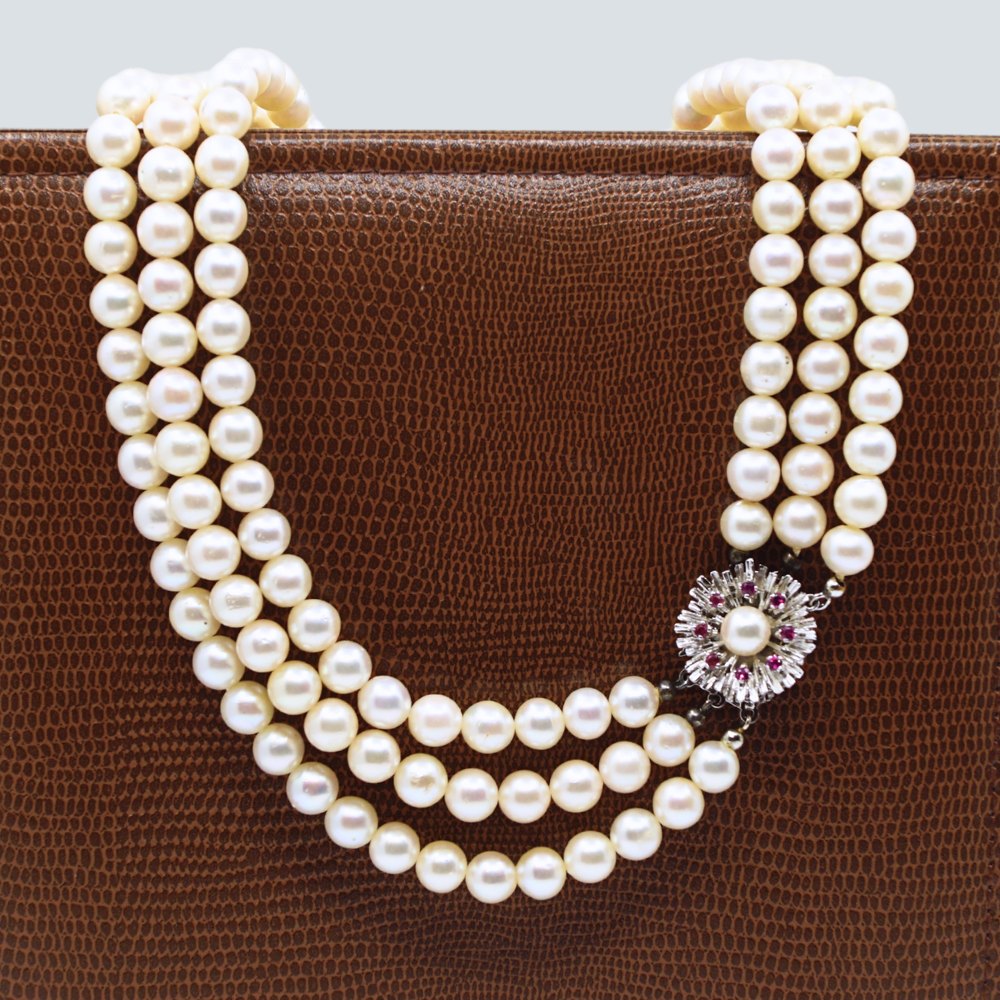 Treradet perlekæde med rund smykkelås i 14 kt. hvidguld, prydet med otte rubiner. Stemplet "585". Længde på kæden 39 cm. Lås diameter 1,8 cm. Perler diameter 7 - 7,5 mm.
