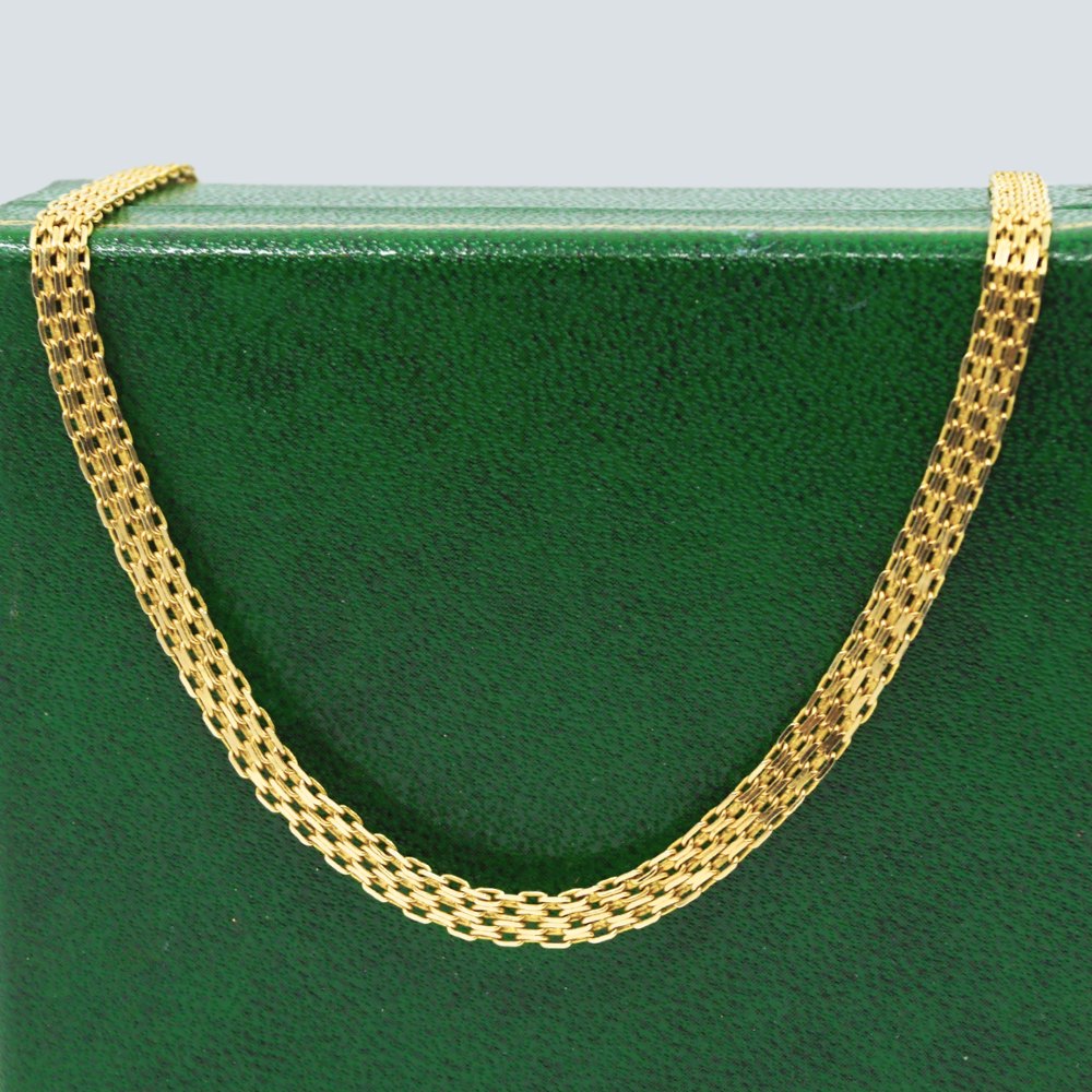 Halskæde i 14 kt. guld. L. 45,5 cm. B. 4 mm. Antik Damgaard-Lauritsen køber guld, sølv og smykker - både til videresalg og til omsmeltning. Vi synes, det er synd at smelte den danske kulturarv - hvis den kan reddes.