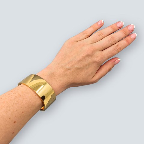 Frantz Hingelberg; Bred armring af 14 kt. guld. Utrolig lækker kvalitet og med kasselås. Indvendige mål: 5,8 cm x 5,1 cm. Stemplet "H585 F.H. 585". Vægt 61,5 gram. Lavet hos Frantz Hingelberg, Århus, Danmark. Dansk guldsmykke.