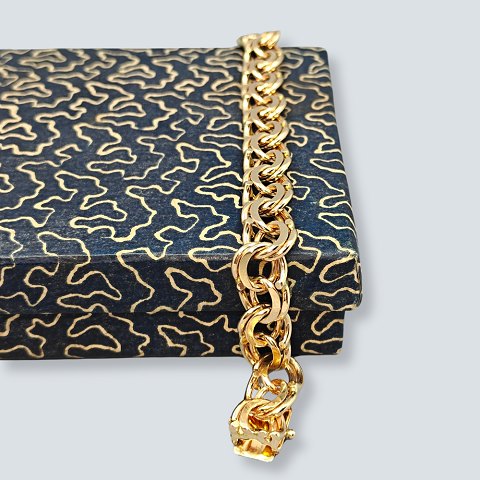 BNH; Kraftigt bismarckarmbånd af 14 kt. guld. Monteret med kasselås samt to sikkerhedslåse. L. 21,8 cm. B. 1 cm. Vægt 35,5 gram Stemplet "BNH 585".