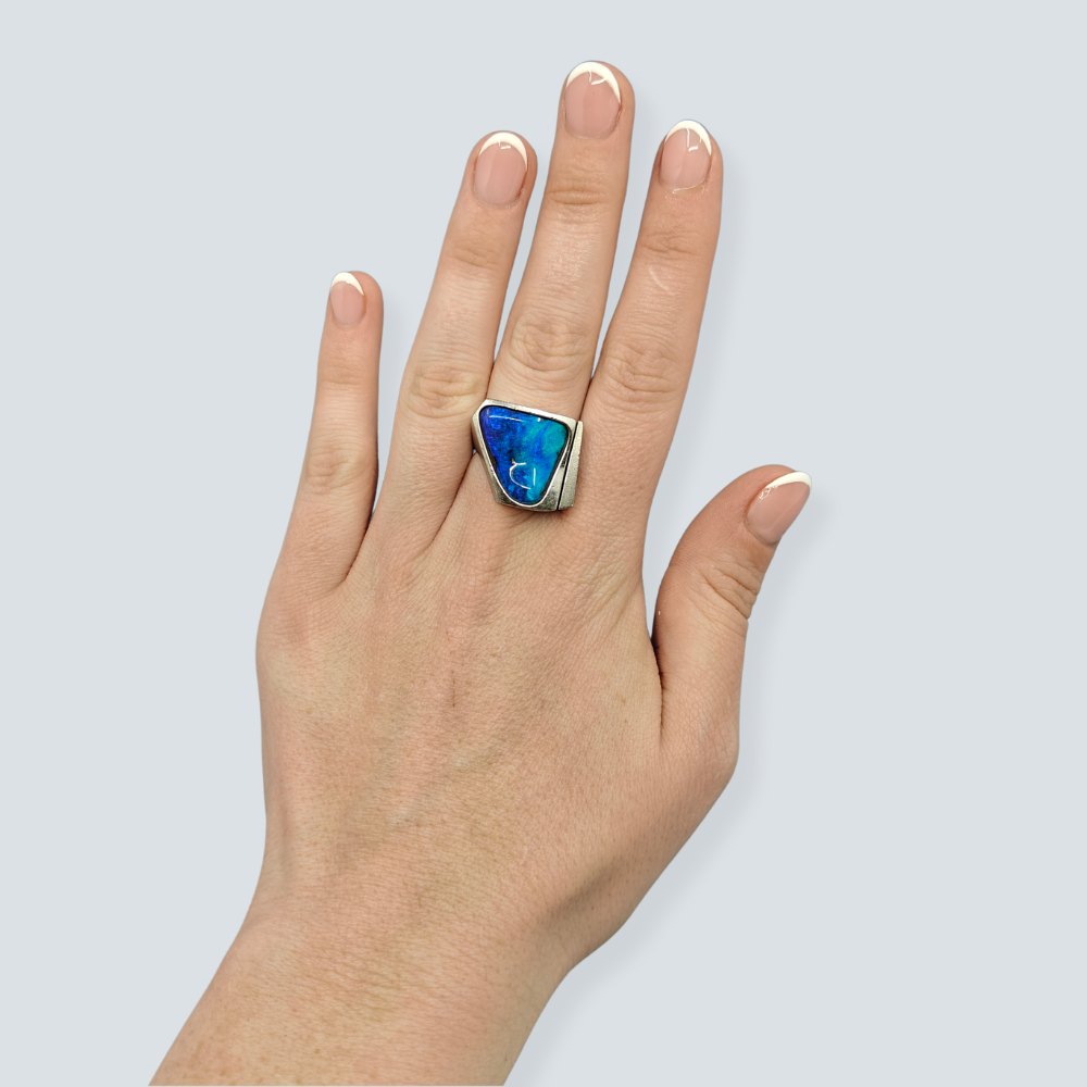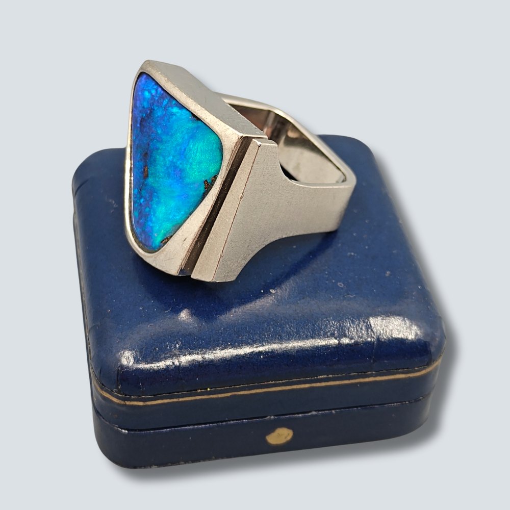 Kraftig ring i 18 kt. hvidguld prydet med en stor trekantet opal. Moderne hvidguldsring str. 56-57. Ringskinne b. 6 mm. Pynt 21 x 22 mm. Vægt 24,8 gram. Schweizisk design smykke.