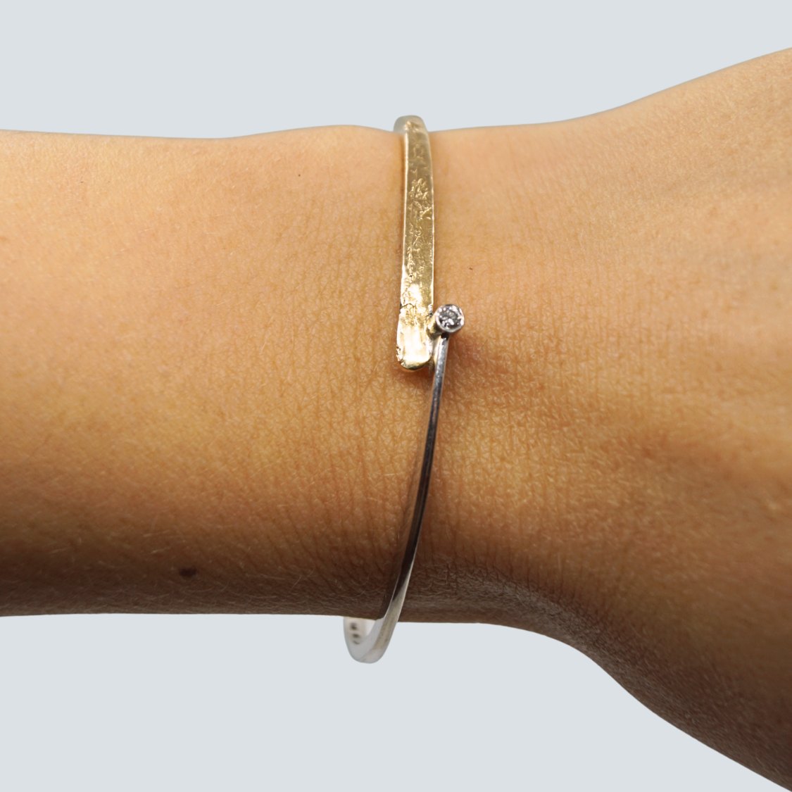 Guldarmring i 14 kt. hvidguld og guld, prydet med diamant i midten. Indvendige mål 5,6 cm x 5 cm. Designet med både glat og materet overflade i guldet.