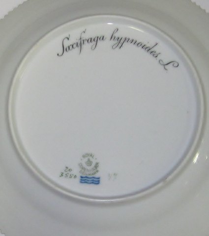 Kgl. Porcelæn Flora Danica Frokosttallerken No 3550. Måler 22cm og er i god stand. Latinsk navn: "Saxifraga Hypnoides L."