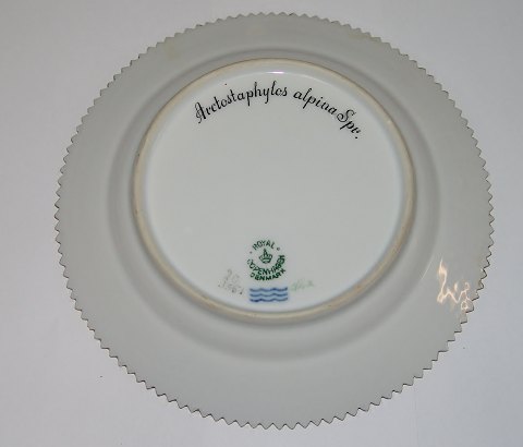 Kgl. Porcelæn Flora Danica Dessert Tallerken No 3551. Latinsk navn: "Arctostaphytos Alpina Spe.". Måler 17,5cm. Har to små afslag. Se billede. Royal Copenhagen