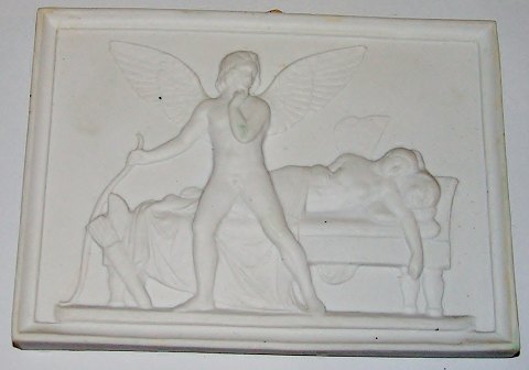 Bing and Grondahl Bisquit Plate - Cupid leaves the sleeping Psyche's bed No. 80. Copy from 1862 after Thorvaldsens original from Nysoe 1841. Measures 15 x 11 cm (5.90 x 4.33 in.)