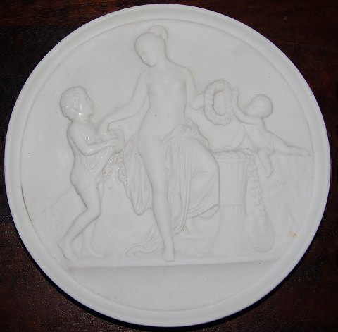 Royal Copenhagen Bisque Plate Childhood and Spring No 117. Copy from 1842-43 by N.G.Henriksen after Thorvaldsens original from Rom 1836. Measures 14,5cm. Has a tiny chip 10.30 O'clock.