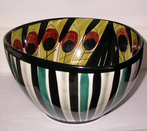 Skål i faiance fra Stavangerflint i Norge. Designet af Inger Waage. Dekoreret med farverigt motiv af påfugl. I perfekt stand. Fabriksmærket på bunden sammen med kunstner initialer I. W. 12½ cm høj og 22 cm i diameter.
