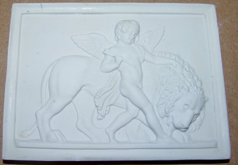 Bing & Grondahl Bisque Plate Amor with the tame Lion No 76. Copy after Thorvaldsens original from Rom 1828. Measures 13,5cm x 10cm.