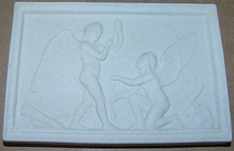 Royal Copenhagen Biscuit Platte Amor og Hymen spinder livets tråd No 74. Kopi af St. Ussing 1849 af Thorvaldsens Original fra Rom 1831. Måler 15cm x 9,5cm.