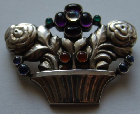 Georg Jensen Sterling Silver Broche No 67 with cabochon amethysts, moonstones, green agates, citrines and sapphires. Measures 4,3cm x 5,5cm. Marked from after 1945. In perfect condition.