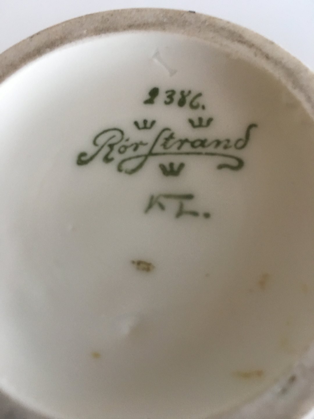 Rørstrand Art Nouveau Unika Lågvase af Karl Lindström. Måler 25cm høj. Standen er god. Men selve vasen er slibet ned. Om det er gjort på fabrikken eller ej, ved jeg ikke. Men ser ud som om det er gjort på fabrikken, for det hele passer.